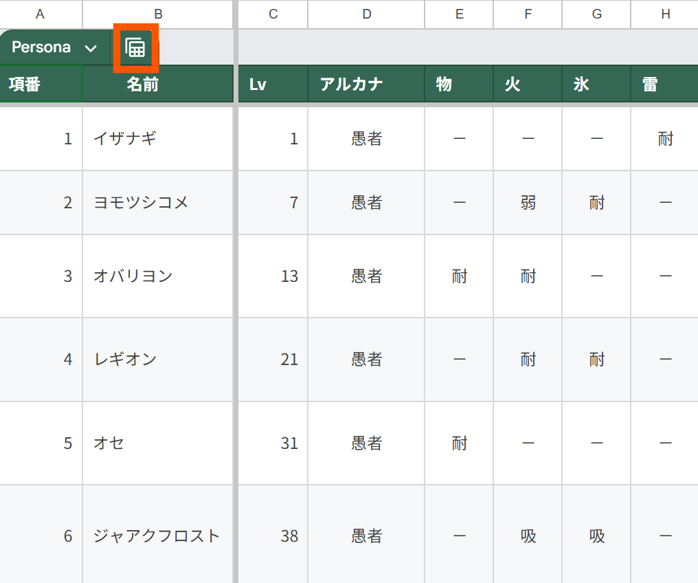 - 例:「ペルソナ」シートで「火」列をグループ化すると、火属性への耐性ごとにペルソナがまとまります。