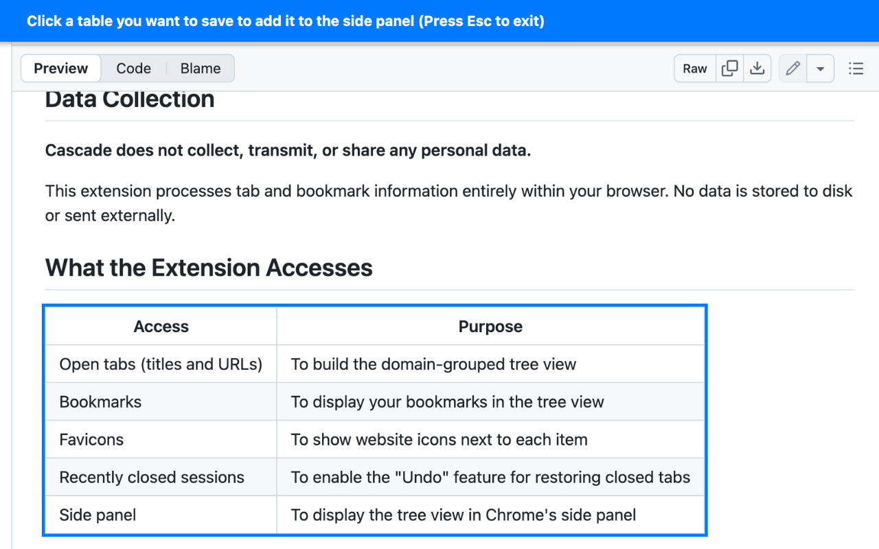 Click the button in the extension, and tables on the current page will be highlighted with a blue outline. Just click a table to add it to the side panel. It also supports extracting tables inside iframes.