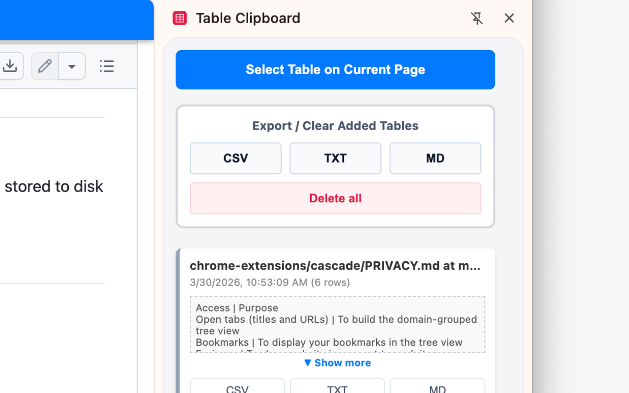 A Chrome extension that lets you collect web tables with a click and export them in CSV, TXT, or Markdown formats.